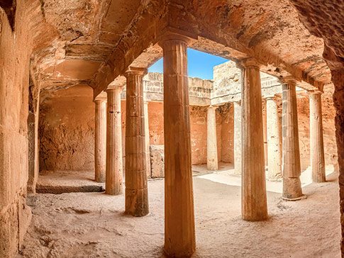 Imagine yourself surrounded by ancient tombs in a desert-like landscape where the only sounds are waves crashing on rocks. The Tombs of the Kings contains a set of well-preserved underground tombs and chambers used by residents of Nea Pafos during the Hellenistic and Roman periods, from the 3rd century BC to the 3rd century AD.